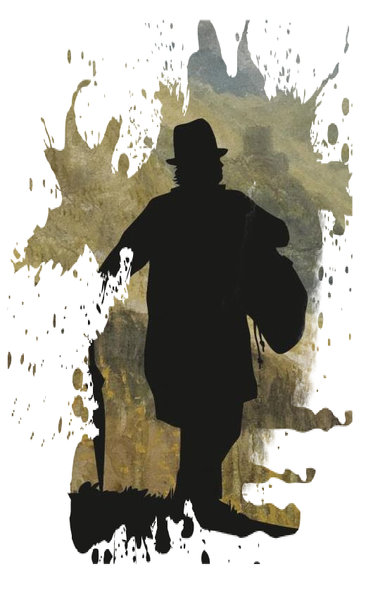 wie die Stadtmauer, lange Schatten. Eine am Wegrand sitzende Person wirkt ähnlich statistenhaft wie die Zimmerleute